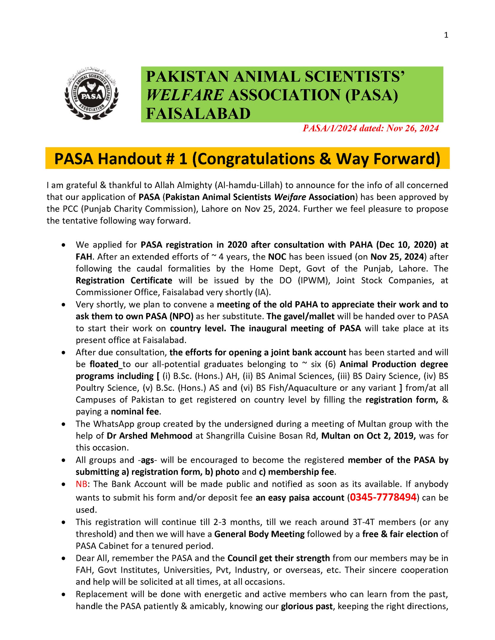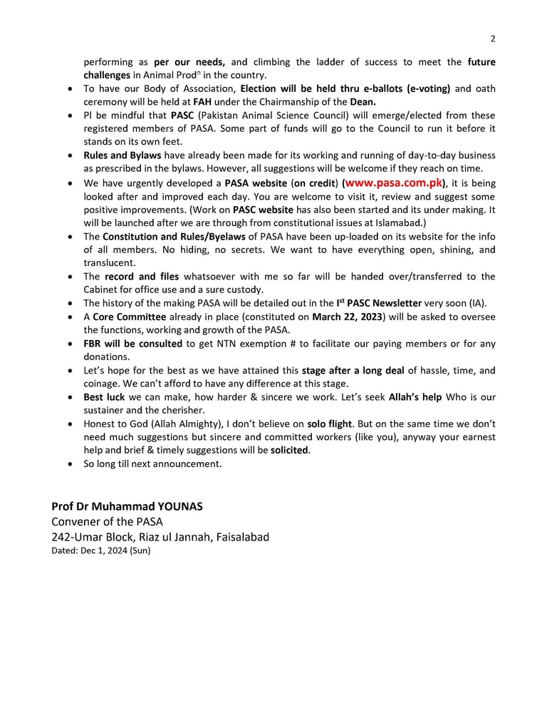 I am grateful & thankful to Allah Almighty (Al-hamdu-Lillah) to announce for the info of all concerned that our application of PASA (Pakistan Animal Scientists Welfare Association) has been approved by the PCC (Punjab Charity Commission), Lahore on Nov 25, 2024.
